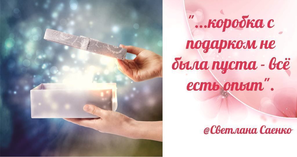 Вы понимаете о чем я? О том, что лишь вы решаете впустить в свою жизнь разочарование от прожитой неудачи или от неоправданных ожиданий, или сотворить чудо в своей жизни, доверившись Вселенной и осознав, что коробка с подарком не была пуста - всё есть опыт.