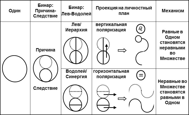 Рис. 2: Схема дуальных проекций ноль-временного Абсолюта в текущий 26000-летний зодиакальный цикл: (1) "Один" - ноль-временной Абсолют, (2) "Бинар Причина-Следствие" - дуальная проекция ноль-временного "Одного" в пространственно-временной 26000-летний земной цикл, (3) "Бинар Лев-Водолей" - дуальная проекция 26000-летнего "Бинара Причина-Следствие" в инволюционно-деструктивный 13000-летний полуцикл "Лев/Иерархия" и эволюционно-конструктивный 13000-летний полуцикл "Водолей/Синергия".