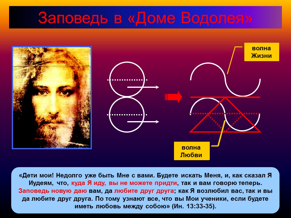 Рис. 6: Эзотерический знаковый смысл Новой Заповеди для эпохи Водолея данной Иисусом - аватаром прошедшей эпохи Рыб: два 3D треугольника (Восток+Запад в планетарном масштабе) в ГОРИЗОНТАЛЬНОЙ "волне Любви" создают один 4D треугольник ВЕРТИКАЛЬНО соединяющий 3D "волну Любви" с 5D "волной Жизни".