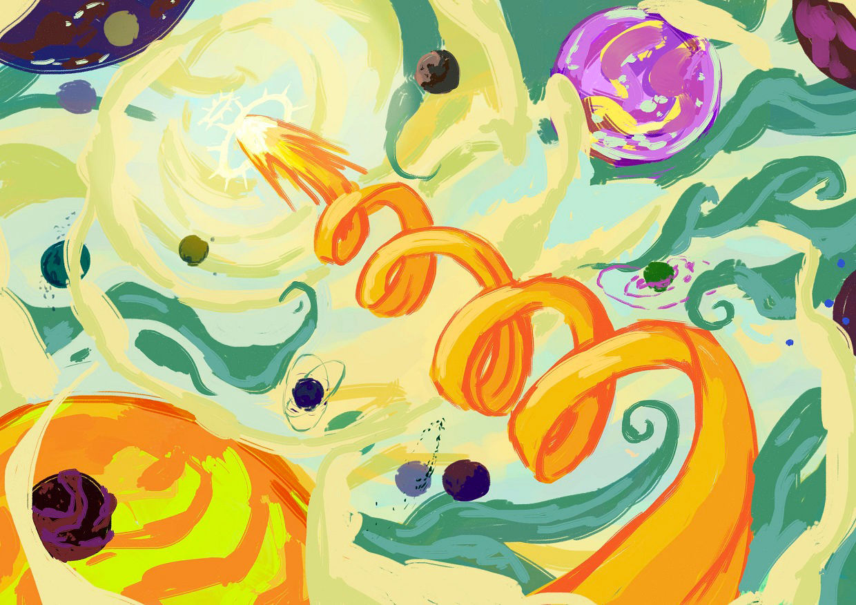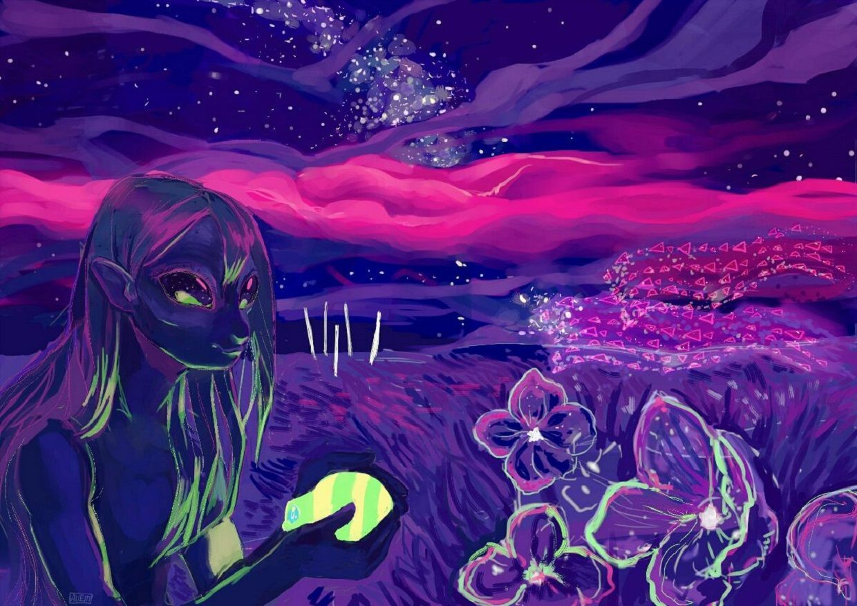 Я вижу неземной пейзаж, красно-синее небо. Я бегу счастливая, счастливая! Смеюсь. Небо всё в звёздах.